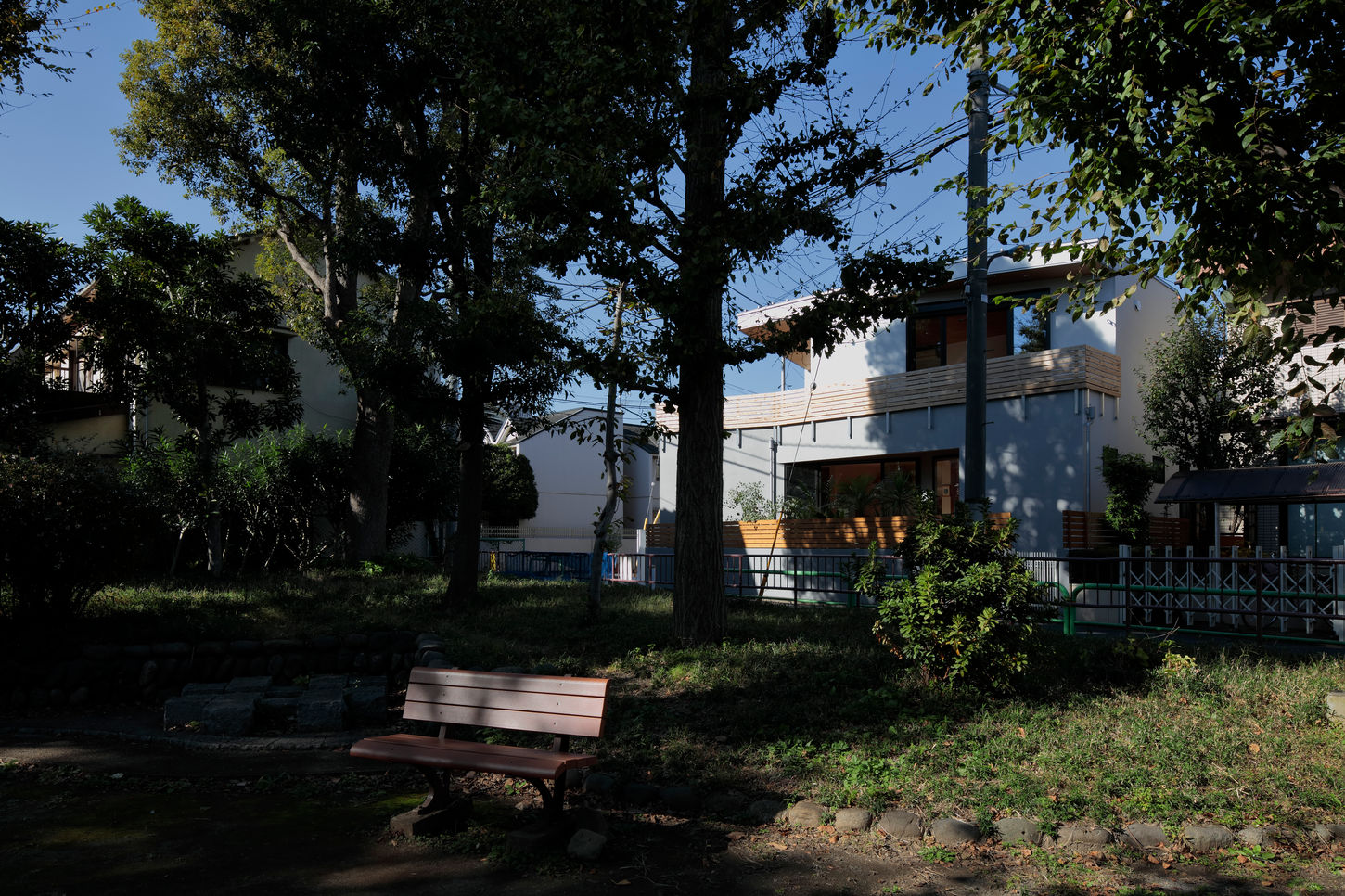 窓の向こうは植栽と公園の緑が見えることで、木々に囲まれ外とつながった空間を作り出します。