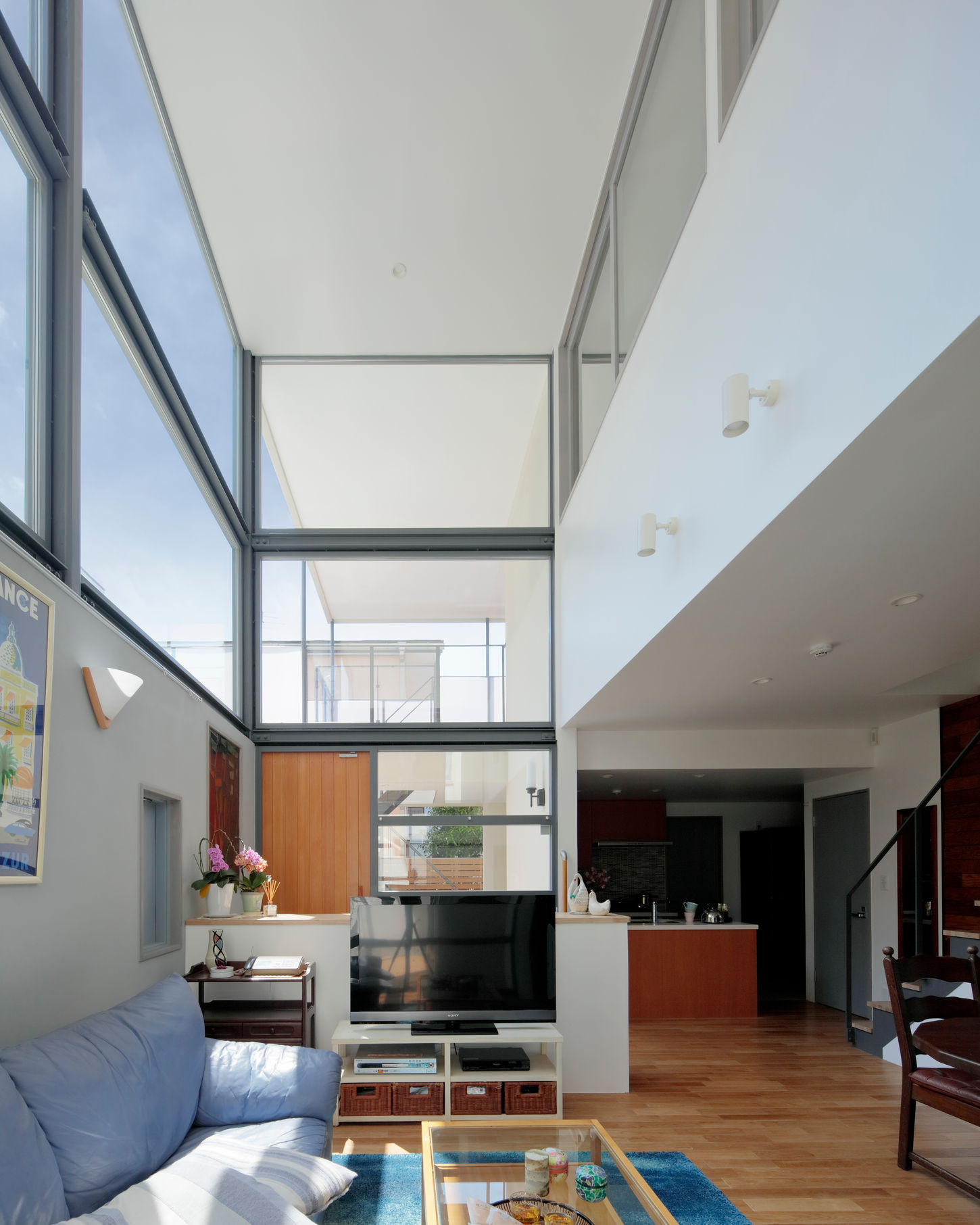 敷地は交通量のある大きな道路に接道した旗竿敷地です。戸建て住宅、店舗や中層マンションに囲まれており、視線を受けやすく、通風や採光が入りにくい等の旗竿敷地ならではの問題がありました。そこで家の周縁部に大きな庇をかけ、光が入り、内部と外部が融合した空間をつくることを目指しました。周囲の建物と距離をとりながら、光が室内にまで入り、風が通ります。庇の下の庭は屋外でありながらも、室内にいるように過ごすことができる場です。